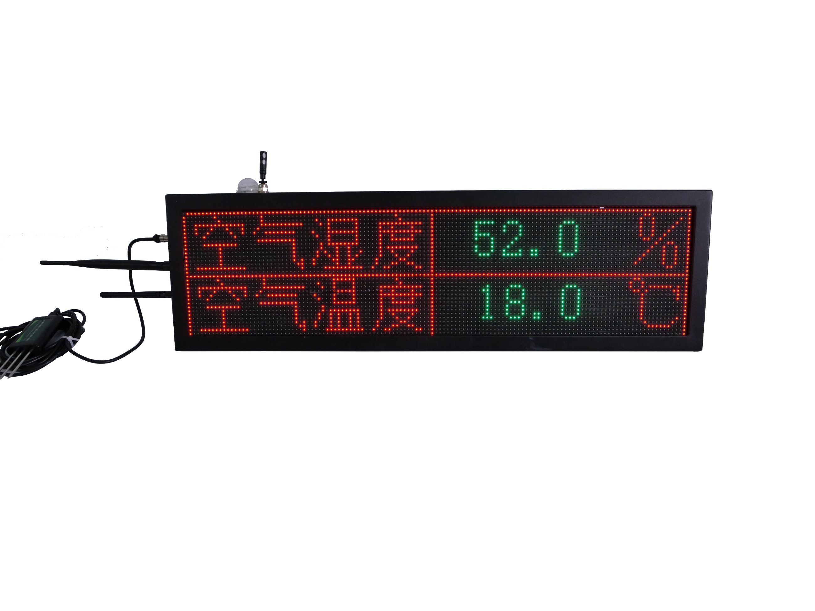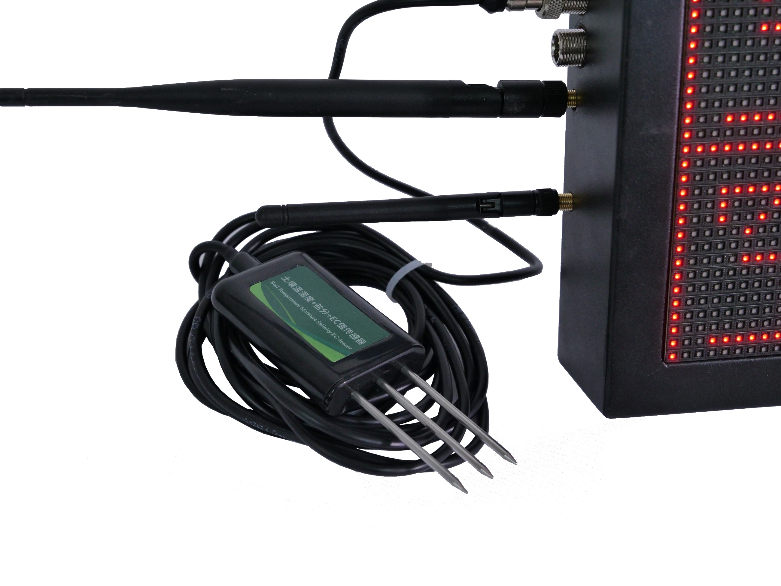 LED環(huán)境六要素采集器外觀為P4.75LED雙色顯示屏設(shè)計,顯示屏可外接多個傳感器,可實時采集溫室大棚內(nèi)的空氣溫度、空氣濕度、光照、二氧化碳濃度、土壤溫度、土壤濕度等環(huán)境數(shù)據(jù),并同步上傳至棚保姆物聯(lián)網(wǎng)平臺,可通過LED環(huán)境六要素采集器自帶的LED雙色顯示屏及棚保姆物聯(lián)網(wǎng)平臺手機APP實時查看監(jiān)測數(shù)據(jù)。
